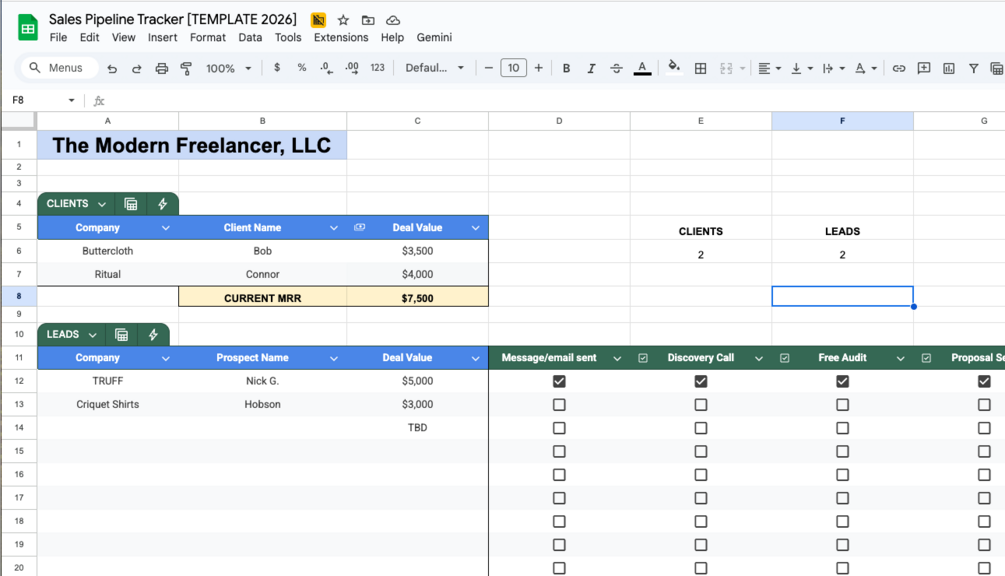 2026 Freelance Sales Pipeline Tracker$0+$0+https://schema.org/InStockusdAlexandre BocquetAlexandre Bocquet1 ratingName a fair price:$I want this!Add to wishlist New wishlistShareShare on XShare on Facebook Copy linkCopy product URLRatings5(1 rating)155 stars100%4 stars0%3 stars0%2 stars0%1 star0%
